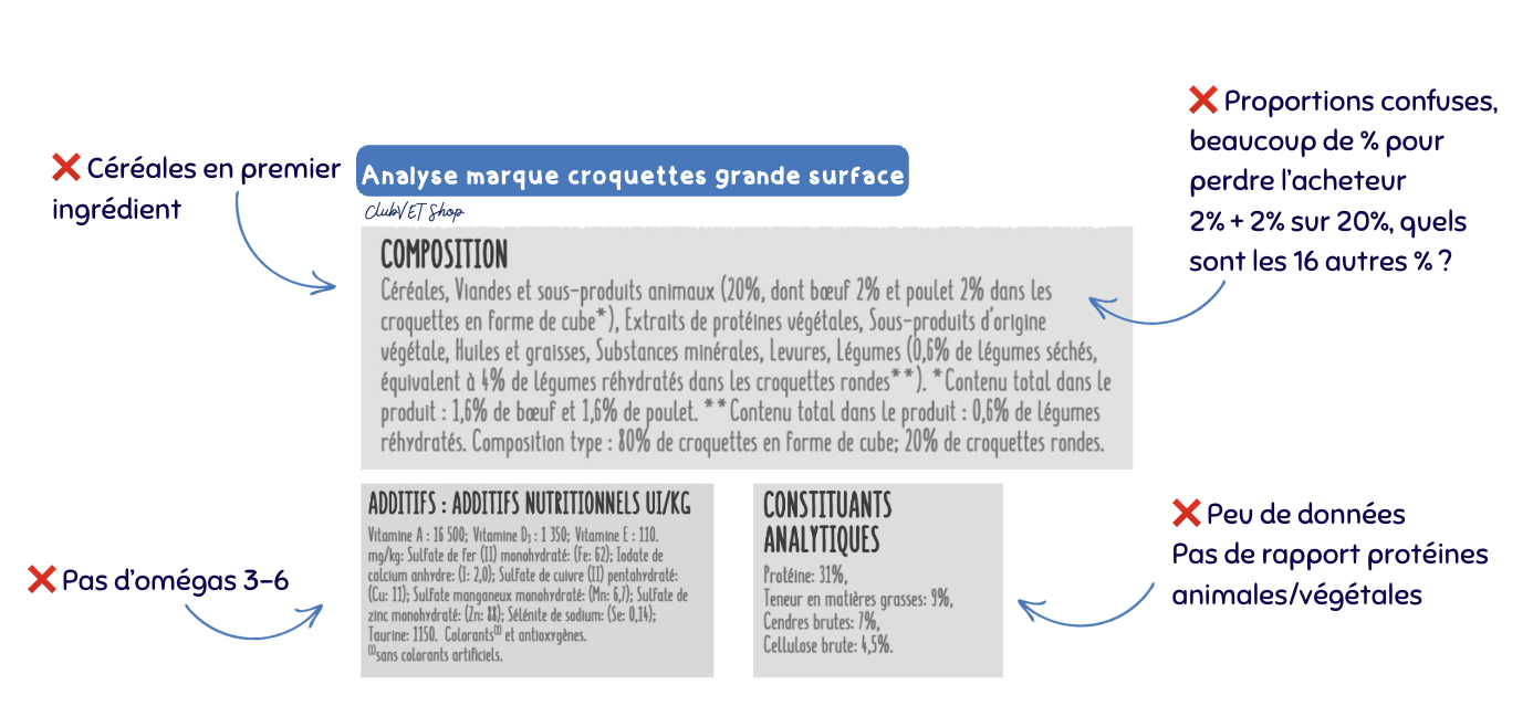 • Supermarché : souvent peu de visibilité sur la traçabilité des ingrédients. Les sous-produits peuvent rester non identifiés, et les formulations utilisent parfois des synonymes pour masquer la présence de céréales ou d’autres composants. Le marketing peut être trompeur : des mentions comme « premium » ou « ultra » ne garantissent pas forcément que l’aliment réponde réellement aux besoins nutritionnels de votre animal. La législation est malheureusement trop permissive sur les emballages et ne protège pas le consommateur.